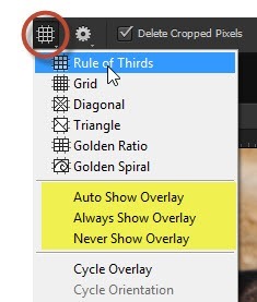 When you start to drag with one of the cropping handles, The Rule of Thirds overlay grid appears by default. If you like to adhere to the Rule of Thirds with your photography, this is very useful, but there are other Overlay Options available too. Here’s how to find them.